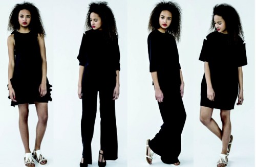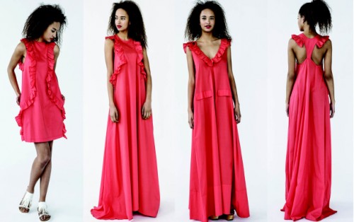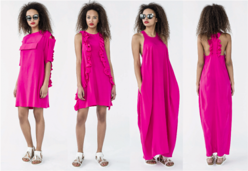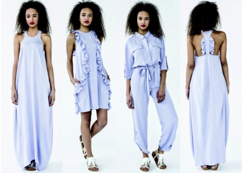 Nohavice sú vyrobené v dvoch dĺžkach, dlhšie predné a skrátené zadné, a sú doplnené s lampasmi z eko kože, ktoré dodávajú nezvyčajnosť. Nežne pôsobiaci šifón je zdôraznený ešte volánikmi, ktorých prevedenie šatám – dlhým aj kratším svedčí. Volániky sa objavujú nielen na šatách, ale aj na sukniach, a to ako na bokoch sukne vo variante kratšia, tak na dlhých k členkom.